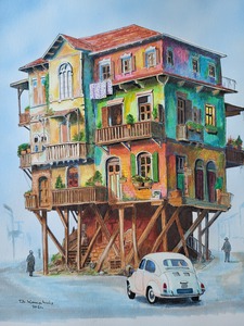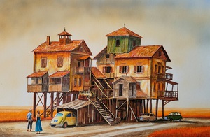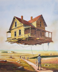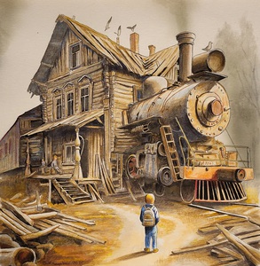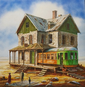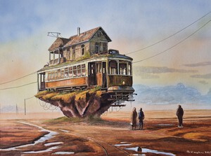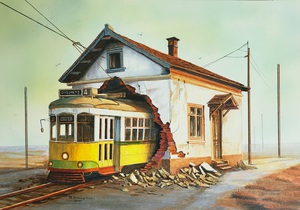 Fantasy buildings, trams and trains, often in trouble.